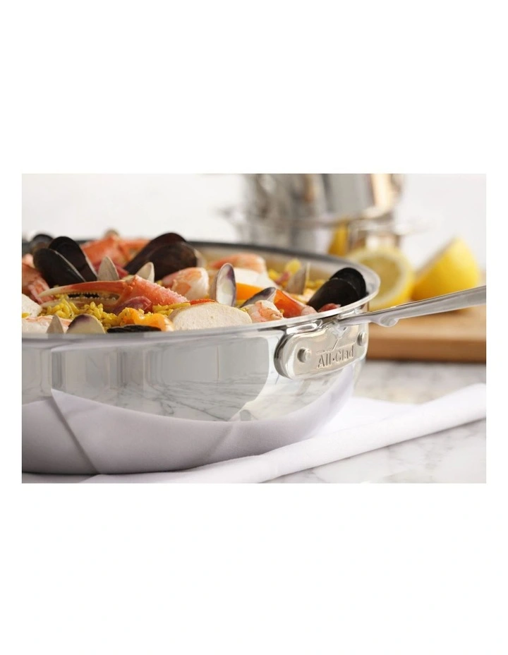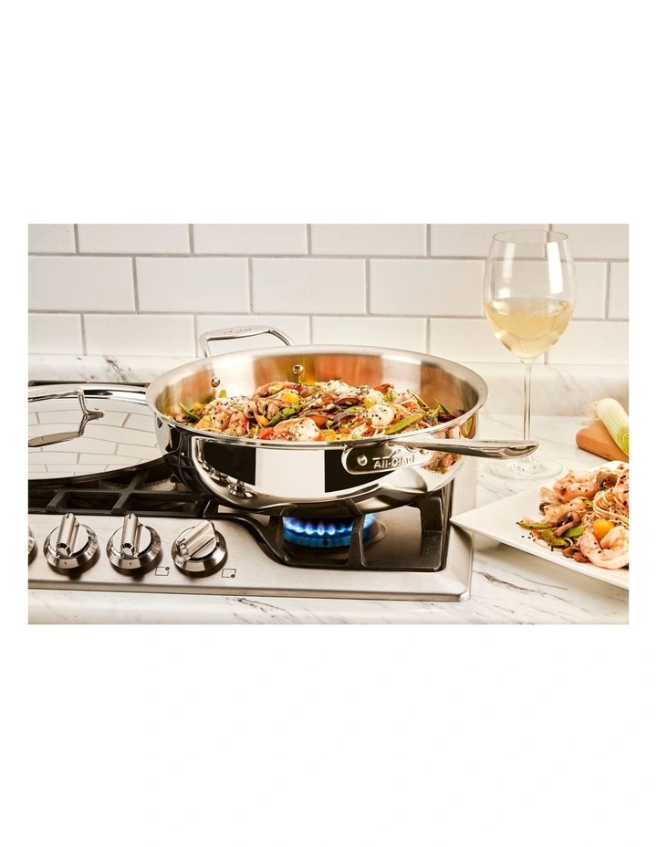 This All-Clad d5 STAINLESS Polished 6-quart/5.6L/36cm essential pan with lid features high rounded sides and a wide surface area that facilitates sauting and stirring of ingredients. The pan is generously sized for braising, stewing, browning, and slow cooking one-pot meals including soups, stews, chilis, and baked casseroles. The lid locks in moisture and heat after cooking to finish dishes on the stovetop or in the oven. The only cookware of its kind, All-Clad d5 STAINLESS features a patented technology of five alternating layers of responsive aluminium and durable heat-diffusing stainless steel. d5 STAINLESS cookware heats slowly and evenly, which means perfectly browned proteins throughout, from the centre all the way to the edge.