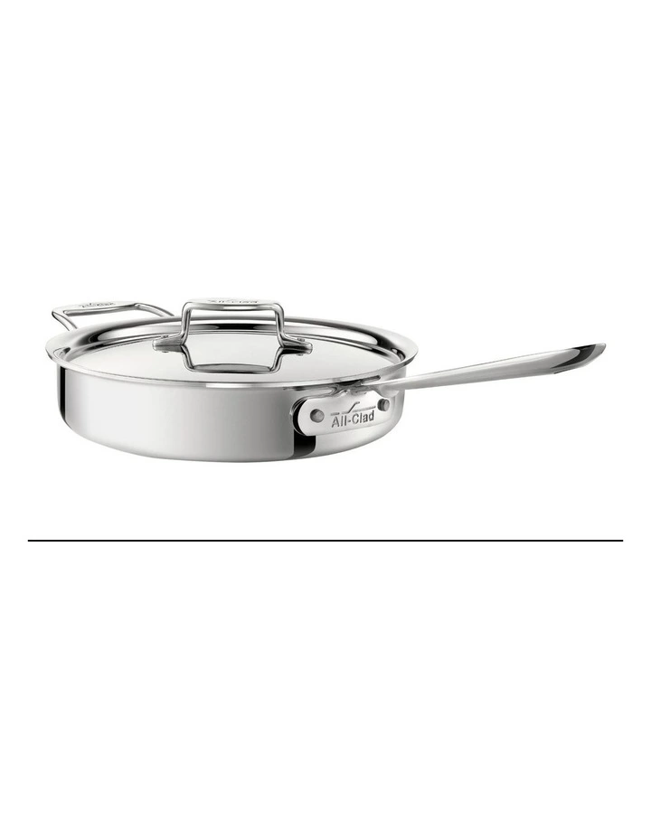 Deeper than a traditional fry pan, this All-Clad d5 STAINLESS Polished SD55403 3Q/2.8L/23cm saut pan features a large surface area and tall, straight sides that hold in juices, prevent splattering, and allow for easy turning with a spatula. Ideal for a wide range of foods including chicken breasts and fish fillets, the saut pan offers the convenience of browning or searing, then deglazing or finishing in liquid; all in one pan. The lid locks in moisture and heat to thoroughly finish meats on the stove top or in the oven.
