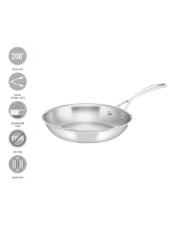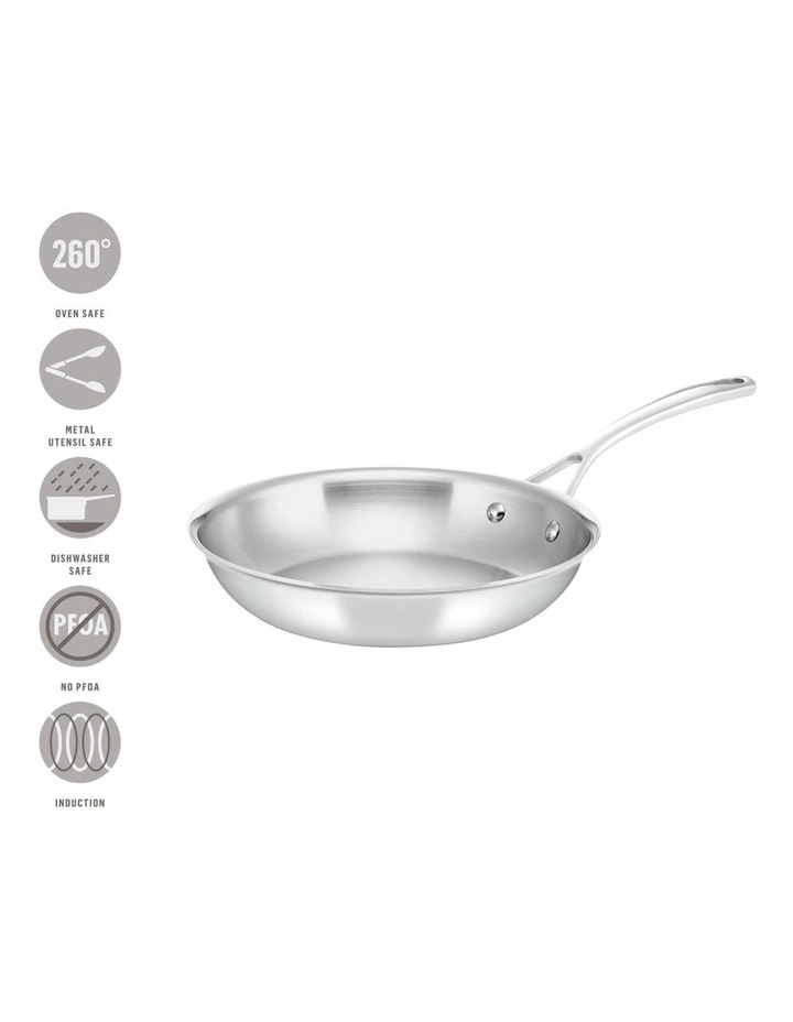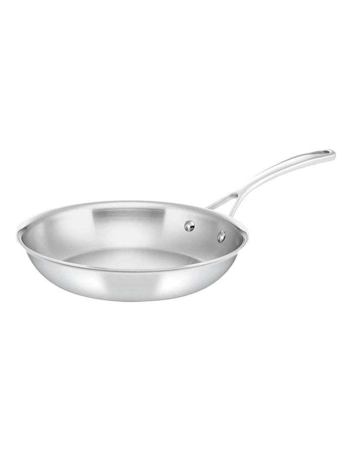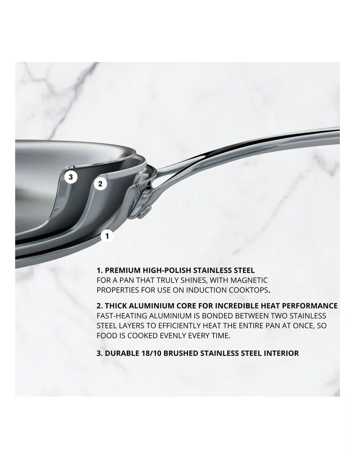 Fast-heating aluminium is bonded between two stainless steel layers to efficiently heat the entire pan at once, so food is cooked evenly every time.