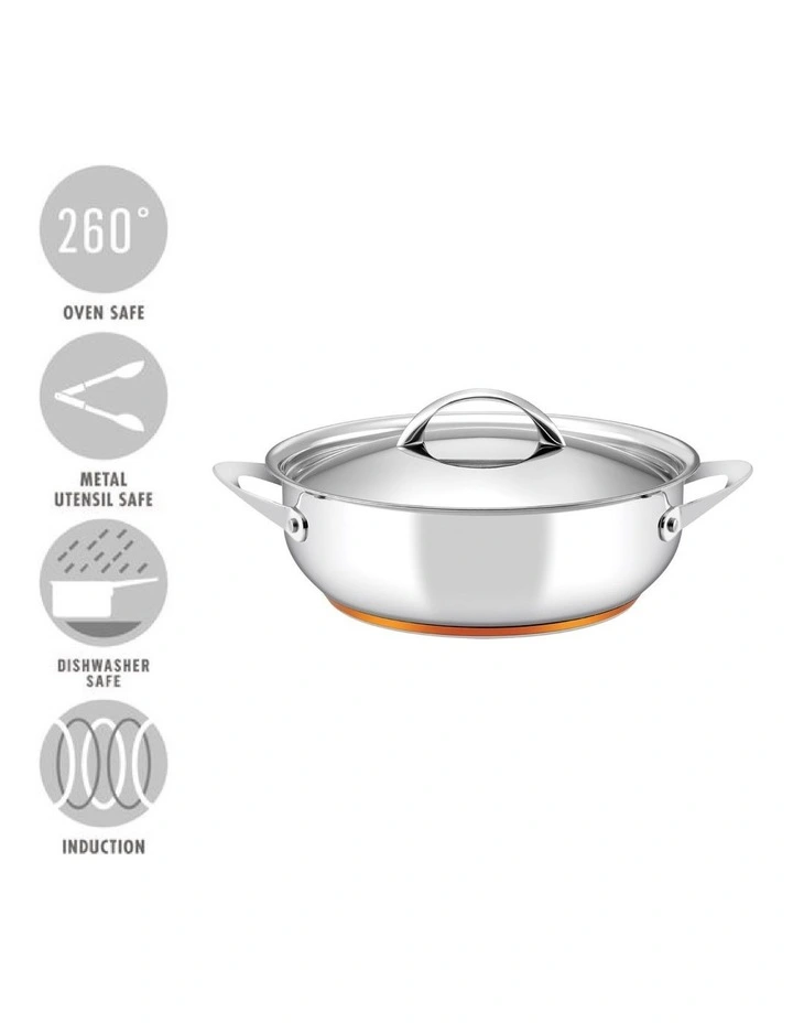 A sheet of solid copper spreads heat rapidly across the base and around the corners of each pan, and heavyweight aluminium discs permanently sealed in stainless steel disperse and retain heat to eliminate hot spots. The result: optimum heat control and induction suitability.