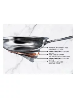 A sheet of solid copper spreads heat rapidly across the base and around the corners of each pan, and heavyweight aluminium discs permanently sealed in stainless steel disperse and retain heat to eliminate hot spots. The result: optimum heat control and induction suitability.