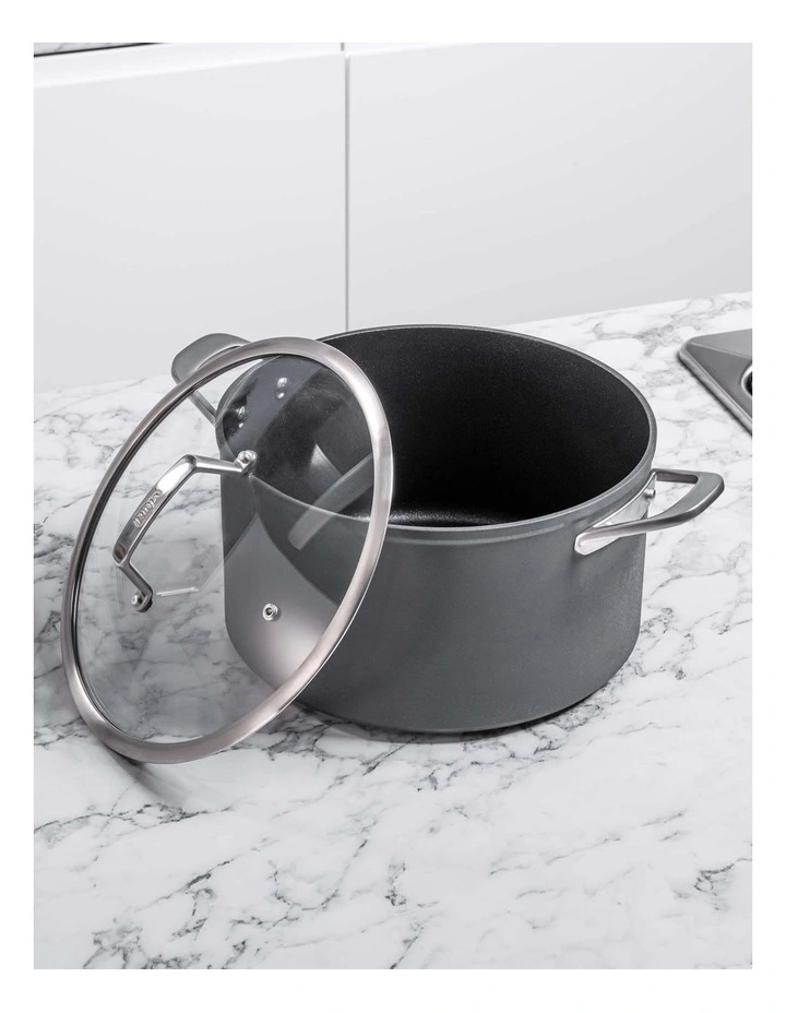 This 26cm Stock Pot includes a high-quality heat-tempered glass lid with a steam vent.