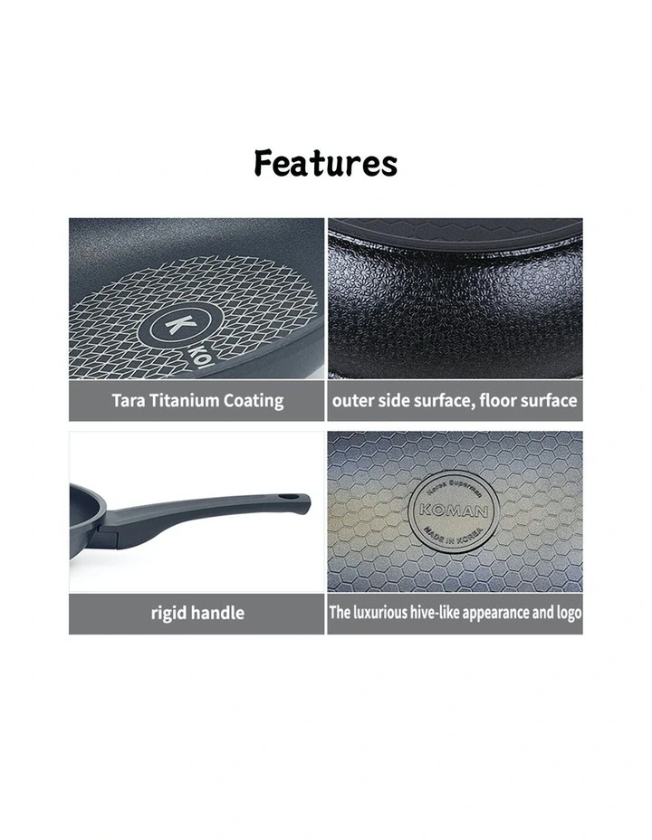 Coated with Tera Titanium(a mixture of titanium used in aviation, ships, cars.) The coating goes beyond its attractive textured look, it gives you the benefits of cooking on hot stone featuring high hardness, superior abrasion resistance and long-lasting Non-Stick performance.