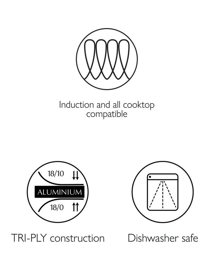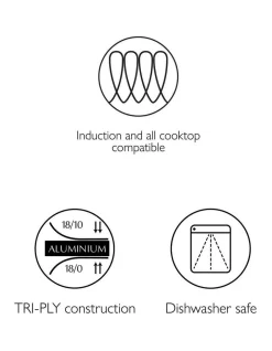- TRI-PLY construction with a premium 18/10 stainless steel interior, rapid heat conducting aluminium core and magnetic stainless steel exterior.