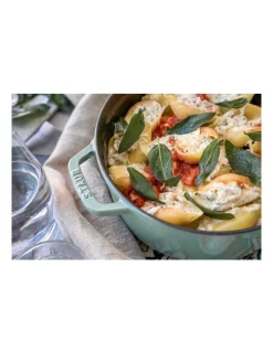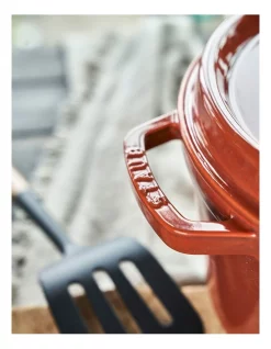 One of Staub’s signature dishes, the ‘Cocotte’ is made in France using a sand mould which is destroyed after each piece is made, meaning every Staub piece is totally unique Heavy, tight fitting flat lid features self-basting spikes for continuous, even distribution of juices throughout cooking Intensify flavours and retain the aromas and vitamins within the food, so food is moist and flavourful Interior black matte enamel finish that requires little seasoning over time and is more resistant to scratches and chips Enamel cast iron is a traditionally strong material, ideal for low heat cooking, it retains heat better than any other material, equal heat distribution eliminates hot spots Smooth bottom is suitable for use on any cooking surface, including induction without scratching the surface of your cook top Suitable for use from oven to table, making a lovely presentation showpiece to impress your dinner guestsHigh quality cast iron lid and baseTough, chip-resistant enamel, inside and outNickel steel knob Handwash