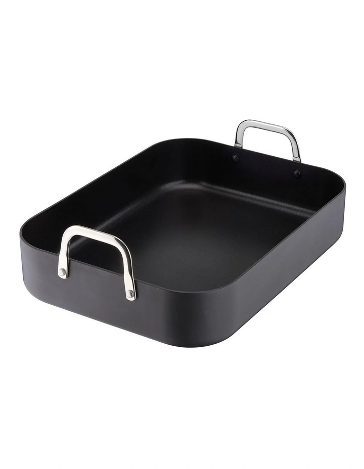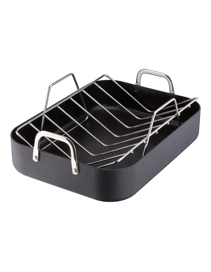Making your famous holiday roast for the family sure is made easier with this Tefal Specialty Hard Anodised Roaster with Rack. Its removable V-shaped rack keeps your poultry or large beef roulade elevated for even browning and lets grease and juices drip down freely. Take it out of the oven safely and easily with the riveted handles. Enjoy effortless unmolding and cleaning with Tefal’s high quality roaster with non-stick coating. The roaster provides perfect heat diffusion and good resistance for long-term use. Its large size is suitable for a wide array of recipes.