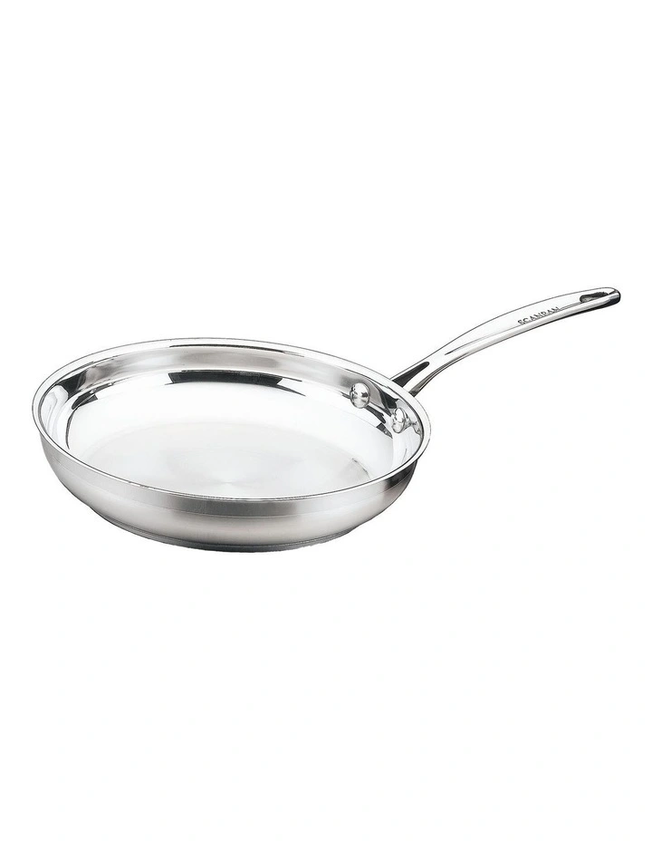 With many years of experience, SCANPAN’s Danish designers have developed the popular stainless steel Impact range with all the features you would expect from SCANPAN. This 26cm Fry Pan has a stylish two tone matt/polished appearance. The optimal 6.4mm thick bonded sandwich base ensures optimal heat distribution. Compatible with all energy sources including induction, this range is as wide as it is popular. The rim design allows for drip-free pouring and the handles are secured with stainless steel rivets. The contemporary satin finish will suit all kitchen decor. A very popular range offering great value for your money!