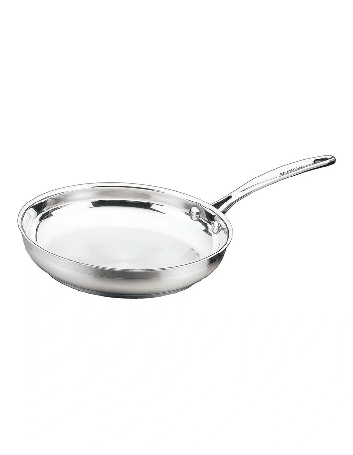 With many years of experience, SCANPAN’s Danish designers have developed the popular stainless steel Impact range with all the features you would expect from SCANPAN. This 28cm Fry Pan has a stylish two tone matt/polished appearance. The optimal 6.4mm thick bonded sandwich base ensures optimal heat distribution. Compatible with all energy sources including induction, this range is as wide as it is popular. The rim design allows for drip-free pouring and the handles are secured with stainless steel rivets. The contemporary satin finish will suit all kitchen decor. A very popular range offering great value for your money!